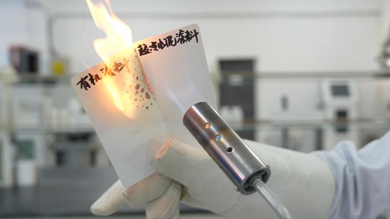 “超冷水泥”材料不仅有降温功能,还有A级防火功能。记者把喷枪对准两种涂料,左边是普通涂料,慢慢的开始着火了;右边是“超冷水泥”涂料,没什么燃烧的痕迹。烧完之后,能够正常的看到左边还在燃烧,而右边并没什么痕迹。